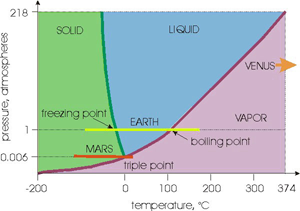 Na Figura 2 temos o chamado Diagrama de Fases da água. Este indica em função da temperatura e da pressão em que condições temos água no estado líquido, gasoso ou sólido. Na figura estão também assinalados as situações para os planetas Vénus, Marte e Terra. No caso da Terra a pressão (ao nível do mar) é de 1 atmosfera com a temperatura a variar aproximadamente entre valores que vão desde os -50ºC a +50ºC o que permite a existência de água no estado líquido. No caso de Marte a água existente no subsolo junto à superfície deve estar no estado sólido. Caso esta água entre em contacto com o ar o mais provável é que passe logo para o estado gasoso. Se a pressão em Marte fosse um pouco superior poderiámos ter água no estado liquido à superfície. No caso de Vénus, dados os valores de pressão e temperatura, a água a existir deve estar sempre no estado gasoso.